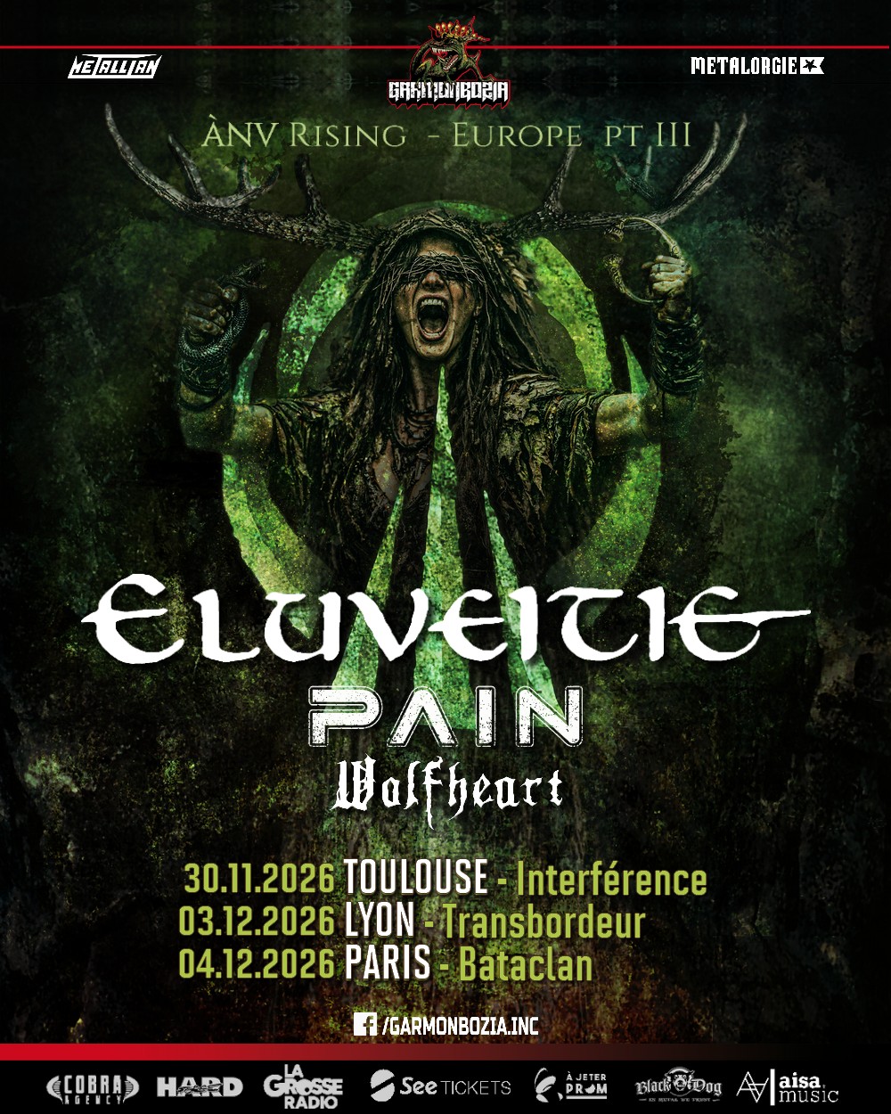 News Eluveitie : tournée annoncée 2 février 2026 Fée Verte Laisser un commentaire Eluveitie présentera son neuvième album Ànv paru en avril 2025 lors d’une tournée à la fin de l’année. Le groupe suisse sera pour l’occasion accompagné de PAIN et Wolfheart. 30/11 Toulouse 03/12 Lyon 04/12 Paris Share : Cliquez pour partager sur Facebook(ouvre dans une nouvelle fenêtre) Facebook Cliquer pour partager sur X(ouvre dans une nouvelle fenêtre) X Cliquez pour partager sur Tumblr(ouvre dans une nouvelle fenêtre) Tumblr Cliquez pour partager sur Pinterest(ouvre dans une nouvelle fenêtre) Pinterest Similaire