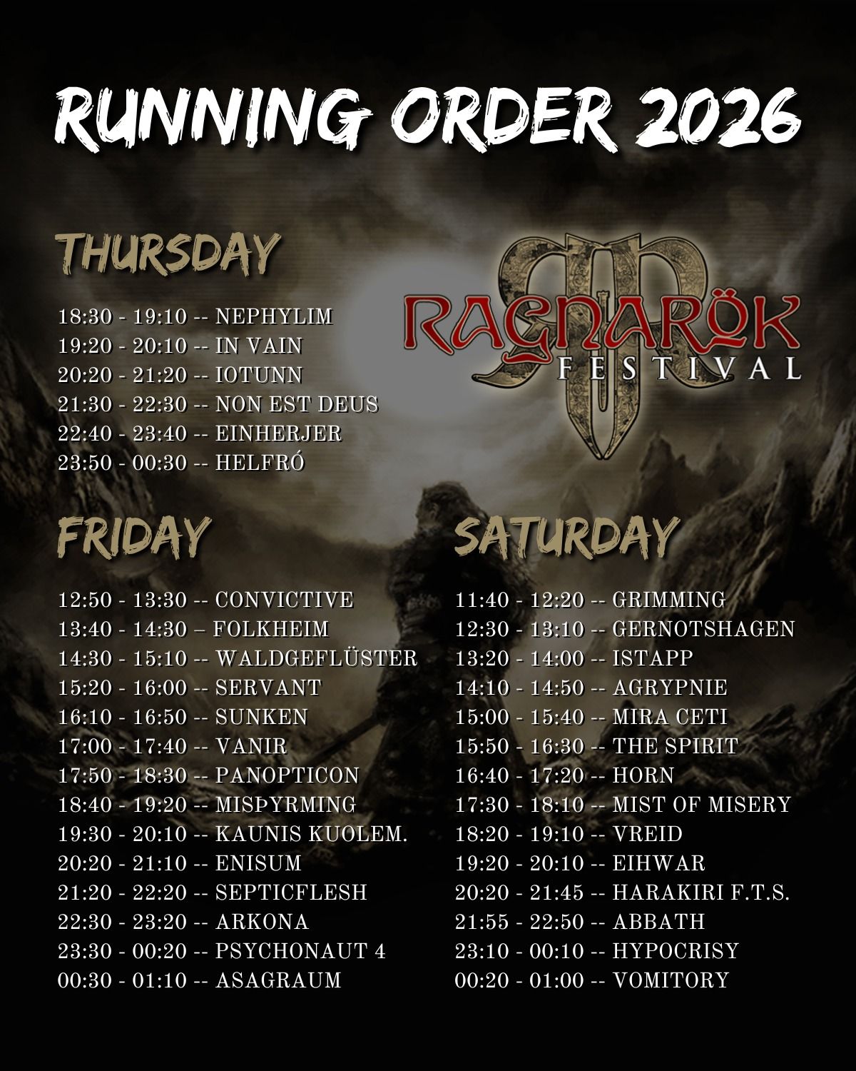 News Ragnarök Festival XXI : running order 7 mars 2026 Fée Verte Laisser un commentaire Le running order du Ragnarök Festival est disponible ! Share : Partager sur Facebook(ouvre dans une nouvelle fenêtre) Facebook Partager sur X(ouvre dans une nouvelle fenêtre) X Partager sur Tumblr(ouvre dans une nouvelle fenêtre) Tumblr Partager sur Pinterest(ouvre dans une nouvelle fenêtre) Pinterest Similaire